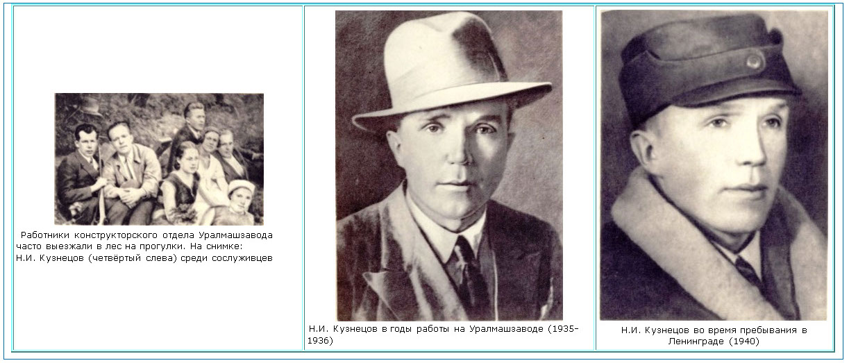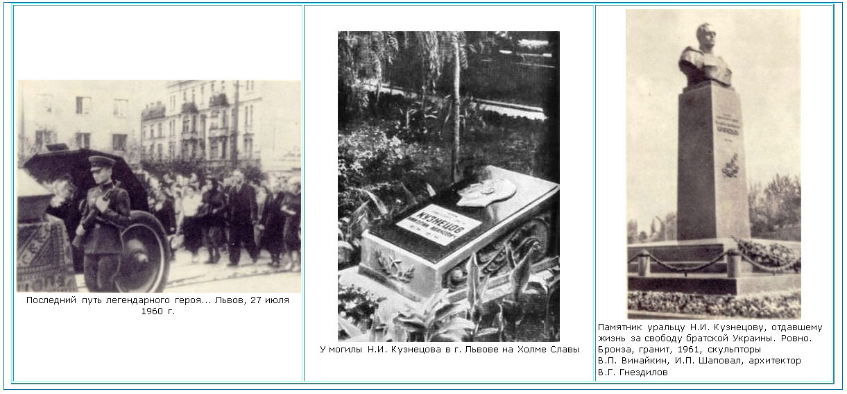 Свердловск (1965, 1971, 1974, 1978, 2003 года) — Музей истории Уралмашзавода — Музей Н.И.Кузнецова в конструкторском бюро Уралмашзавода — Памятник Н.И.Кузнецову на Площади Культуры — Свердловская киностудия — Свердловский индустриальный институт — Улица Н.И.Кузнецова — Школа-музей Н.И.Кузнецова в школе №72 — Музей истории комсомольских и пионерских организаций Урала